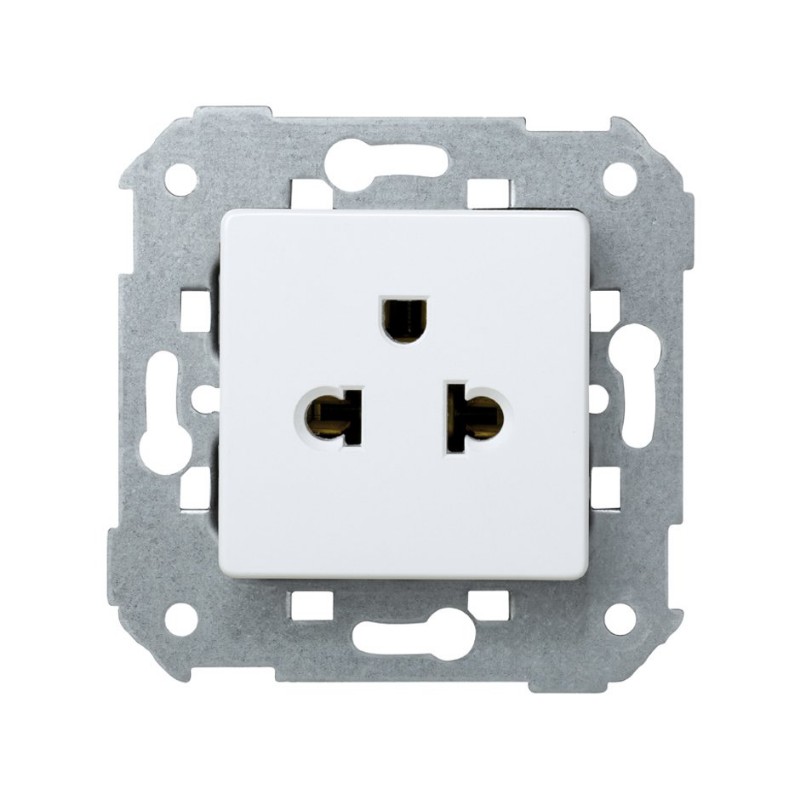 Se encuentra dentro las categorías de tomas de corriente, tiene una intensidad de 15-16 A y voltaje 125-250 V~ de un elemento, con toma tierra y embornamiento a tornillo, pertenece a la gama Simon 27 Play. La base de enchufe bipolar mixta (europea-americana) goza de funcionamiento de inserción, es apto para 2 módulos, esta pieza es válida para reposición o exportación. Para su instalación bastará con hacer presión o colocar sobre la superficie. La sección de cable admitida es de 1,5 a 2,5 mm y trae 10 mm de cable pelado. El material es a base componentes metálicos con aislamiento termoplástico libre de halógenos y embellecedor termoestable, pudiendo oscilar entre los 5 y 40º, y llegando a soportar hasta un máximo de entre -25 y 50º C, este artículo cumple perfectamente con la normativa IEC 60884-1:2006 – Ed.3.1. Las dimensiones son de 45×45 mm aunque también disponemos de otros tamaños y colores. Para mantener limpia la pieza puede utilizar un paño suave y seco, bajo ningún concepto se deberá verter paños o limpiadores abrasivos con altos contenidos de cloro.