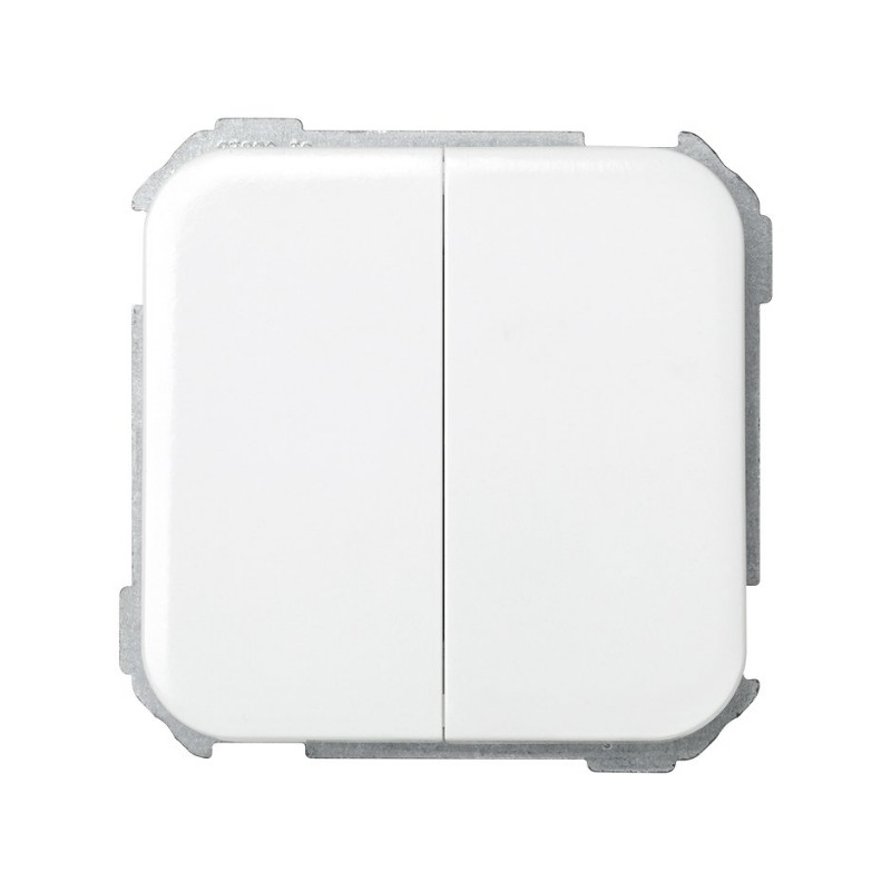 Grupo de 2 conmutadores 10 AX 250V~ con sistema de embornamiento rápido incluido en esta gama de Simon, circunstancia que permite escoger marco con el mismo color de la tecla seleccionada.