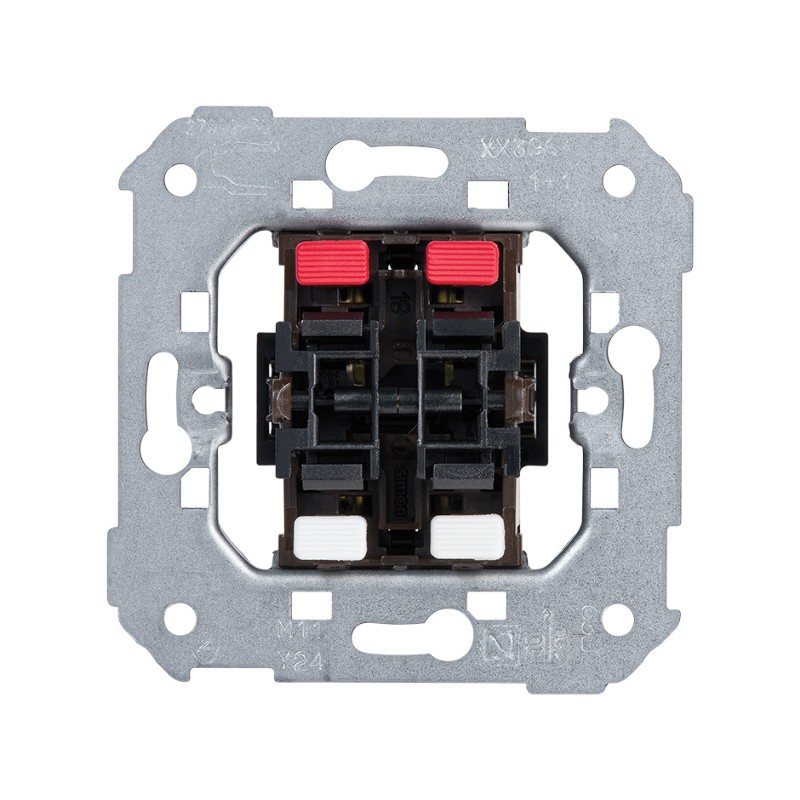 La serie Simon 75 da una respuesta precisa a las nuevas exigencias del mercado. Con este objetivo se ha creado el Grupo de dos pulsadores con intensidad de 10 A y voltaje de 250V~ que incluye dos entradas y dos salidas. Es apto para mecanismos de persianas sin sistema de enclavamiento con embornamiento rápido. Estamos ante un mecanismo válido para los productos incluidos en las series Simon 75, 82 y 88.