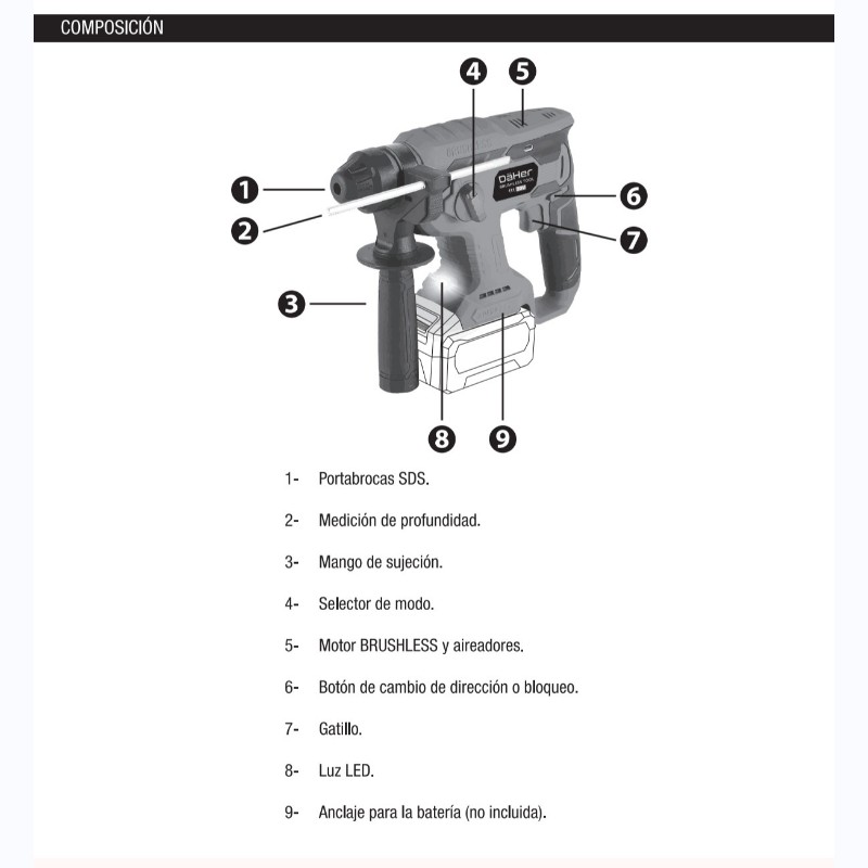 - Batería Li-Ion: 2.0/4.0Ah (no incluida).