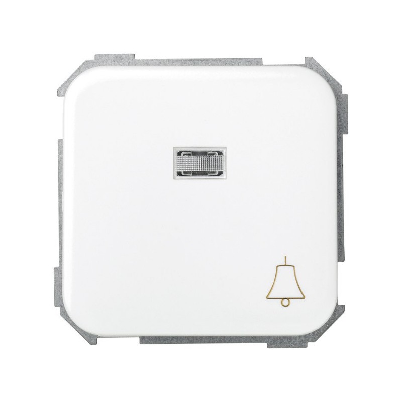 Pulsador de la serie Simon 31, con grabado campaña, luminoso incorporado y sistema de embornamiento rápido.