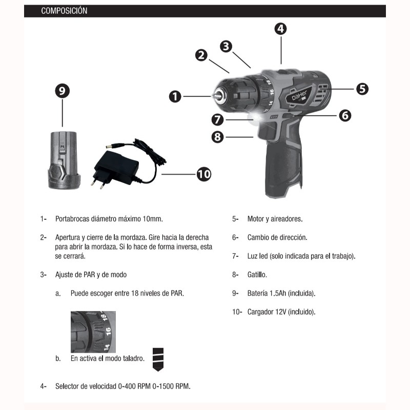 - Portabrocas: 10mm máx.