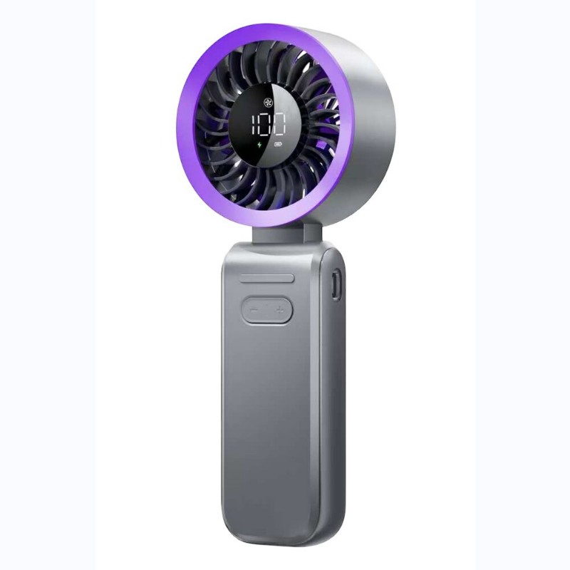 Ventilador portátil con mango plegable, pantalla digital y carga USB-C. La pantalla muestra la velocidad actual del viento (número digital),